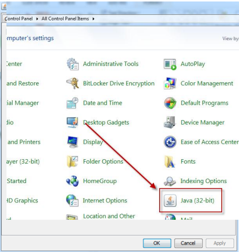 - Trong cửa sổ Control Panel, tìm và nhấp vào biểu tượng Java.