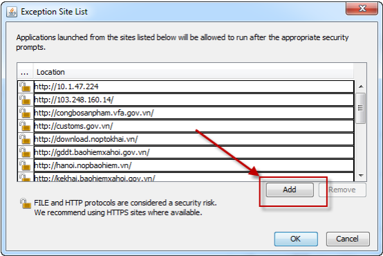 - Trong cửa sổ Exception Site List, nhấn nút Add.