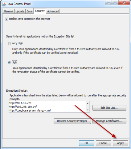 - Nhấn OK để đóng cửa sổ Java Control Panel.