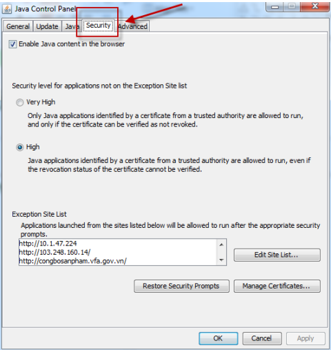 - Trong cửa sổ Java Control Panel, chọn tab Security.
